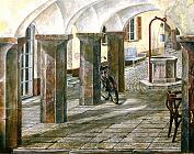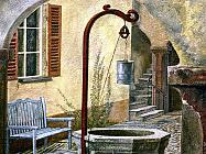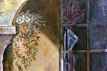 Während ich an dem Wandbild malte, versuchte ein Kätzchen vergeblich auf den Brunnen inmitten des Bildes zu hopsen, was mich an die Anekdote vom Wettstreit der beiden antiken griechischen Maler Zeuxis und Parrhasios erinnerte: Zeuxis malte Weintrauben so echt, dass die Vögel sie anpicken wollten, doch als er einen Vorhang vor Parrhasios Bild wegzuraffen versuchte, der sich als gemalt erwies, musste er anerkennen, dass jener ihn übertraf.