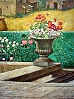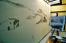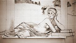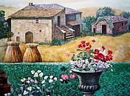 Die Wandmalerei bringt die Sonne der Toskana in den engen, fensterlosen Durchgangsraum einer Hausvilla in Grünwald bei München. Das gemalte Glasdach, sowie die Steinplatten der Terrasse sind Replik des vorhandenen Baubestands. Der Fensterbanküberrest eines zugemauerten Fensters wurde als Bank der liegenden Nymphe kaschiert. Humoristisches Beiwerk - der Hund des Auftraggebers wurde "in Stein gemeißelt". Der geringe Abstand zum Betrachter erforderte minuziöses Malen. Die Arbeit wurde in etwa 30 Tagen vollendet.