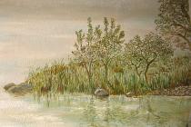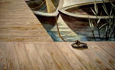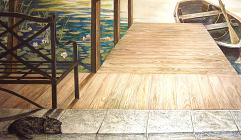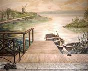 Ohne die Wandmalerei würde in dem winzigen Raum Platzangst aufkommen. Die Illusionsmalerei lässt eine der Wände entschwinden. Die Perspektive des Stegs entführt den Blick in die Tiefe. Das Wandbild wurde detailgetreu und präzise gemalt, da es sich um ein Gemälde handelt, das man auch aus der Nähe zu studieren vermag. Ausführung etwa 8-9 Tage, die Zeit für den Entwurf nicht gerechnet.