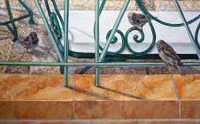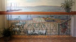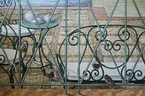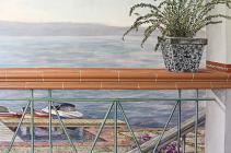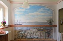 Ein "Küchenbild". Altbau in Köpenick. Die Wandmalerei in der Küche der Wohnung greift den Fensterbogen der anlehnenden Wand auf, lässt eine Veranda mit Blick auf den Müggelsee entstehen. Eine Bordüre in der Wandmitte wurde als Geländer kaschiert. Die Steinfliesen der Schwelle imitieren die Riemchen des Sockels und Fußbodenfliesen. Das Teeservice - ein Erbstück von der Großmutter. Den Blumentopf gibt es wirklich. Das eiserne Gitter zu malen – eine Geduldsprobe. Spatzenvolk beim Frühstück sorgt für Belebung. Drei Wochen Fleißarbeit.